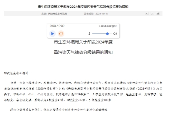天津钢管以服务京津冀区域协同绿色发展为己任,2024年初,在通过超低排放评估公示的基础上,持续完善有组织与无组织排放治理措施,不断提高超低排放治理水平,并持续更新货运车辆与非道路移动机械,协调采购、销售、物流等多部门,细分品类、逐项攻关,稳步提升大宗物料及产品清洁运输比例至80%以上。2024年9月23日,天津钢管顺利通过天津市生态环境局组织的现场绩效评估;10月17日,天津市生态环境局在官方网站发布绩效评级结果,天津钢管被评定为环保绩效A级企业。天津钢管将通过提高重视程度、完善管控细节、强化管理能力等积极措施,确保环保管理水平持续保持并稳步提升,持续满足环保绩效A级企业相关要求。