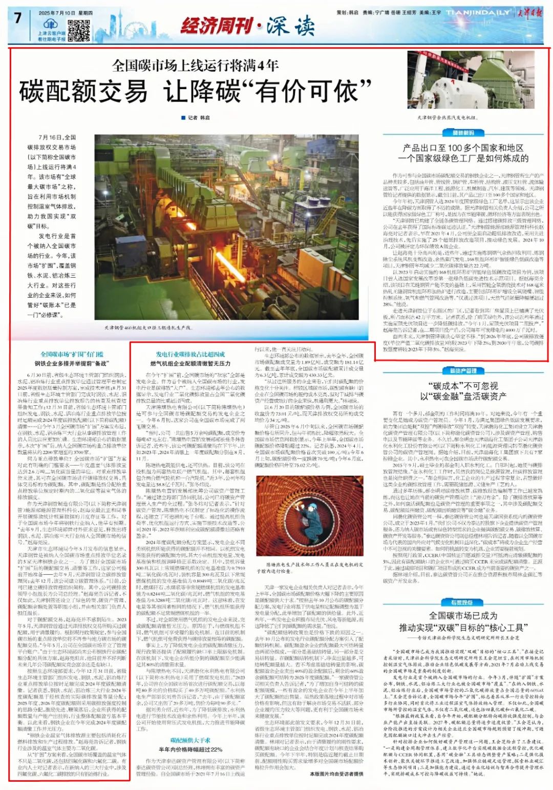 天津市生态环境局今年5月发布的信息显示,天津钢管是被纳入全国碳市场重点排放单位名录的5家天津钢铁企业之一。为了做好全国碳市场“扩围”后的碳配额交易、清缴等工作,这家公司提前开始准备——去年9月,天津钢管设立碳排放管理岗;去年12月,该公司建立碳管理体系。“目前,公司已建立碳排放管理组织架构。其中,公司碳排放领导小组组长为公司总经理。”赵海亮告诉记者,不仅如此,天津钢管还设立了绿色转型、碳资产管理、碳配额余额处置等职能小组,并由相关部门负责人担任组长。
