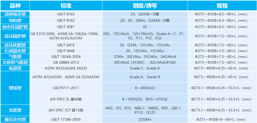 公司主要品种为石油天然气输送管、管线管、结构管。产品广泛应用于能源、化工、机械、基础建设等领域。